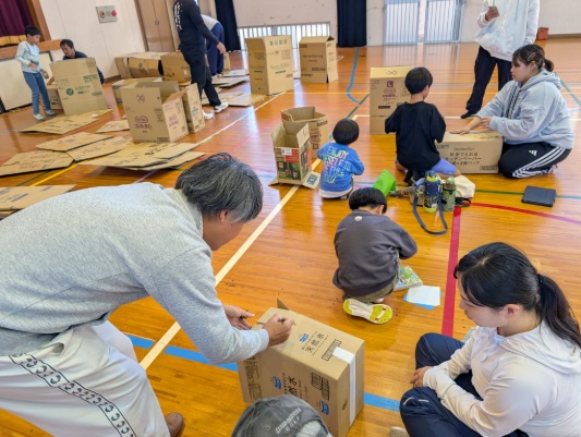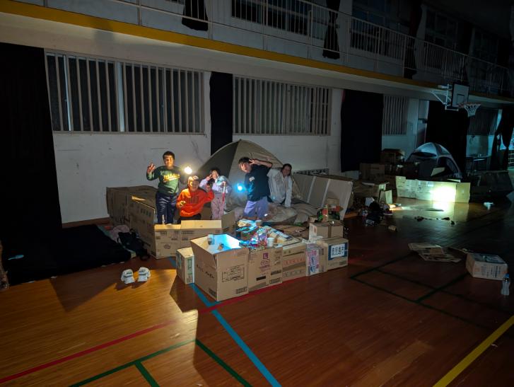 段ボール防災グッズやペットボトルろ過装置など防災グッズ作り体験や防災食自炊、停電時の食事体験、体育館宿泊など、万が一のときに備えて、避難所体験を行いました。明くる日には、あいごリーダー企画イベントで楽しみました。